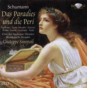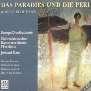 Peri ist die persische Bezeichnung für eine Elfe. Sie versucht als Kind eines gefallenen Engels und einer Sterblichen Zutritt zum Paradies zu erlangen. Zwei ihrer Opfergaben werden von den himmlischen Wächtern nicht anerkannt, erst mit der dritten erreicht sie ihr Ziel, den Tränen eines Verbrechers beim Anblick eines betenden Knaben. Das allzu sentimentale Libretto und die Geschichte, die nicht mehr so ganz in die heutige Gefühlswelt passt, werden dazu beigetragen haben, dass Schumanns Oratorium nur noch selten aufgeführt wird.
